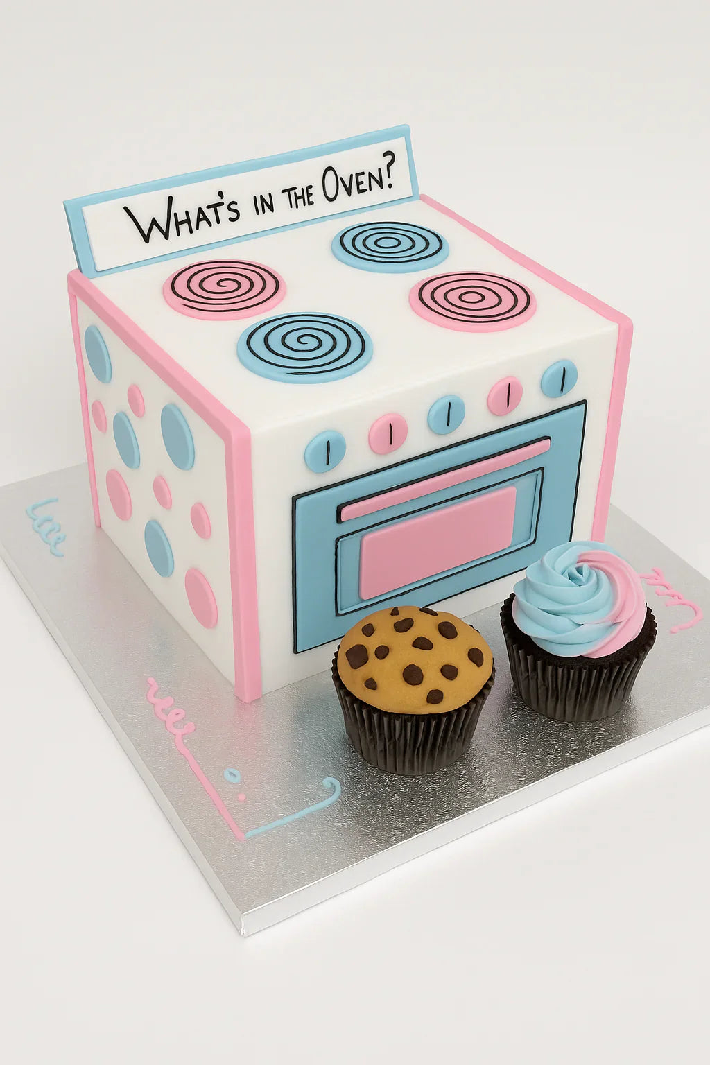 +447359778589A quirky oven-themed fondant cake is a fun centrepiece for your gender reveal celebration. Allergen Info: Contains allergens and may have traces of others due to cross-contamination. We do not accept allergy-specific orders. Not suitable for allergy sufferers. Please speak to staff for full details.